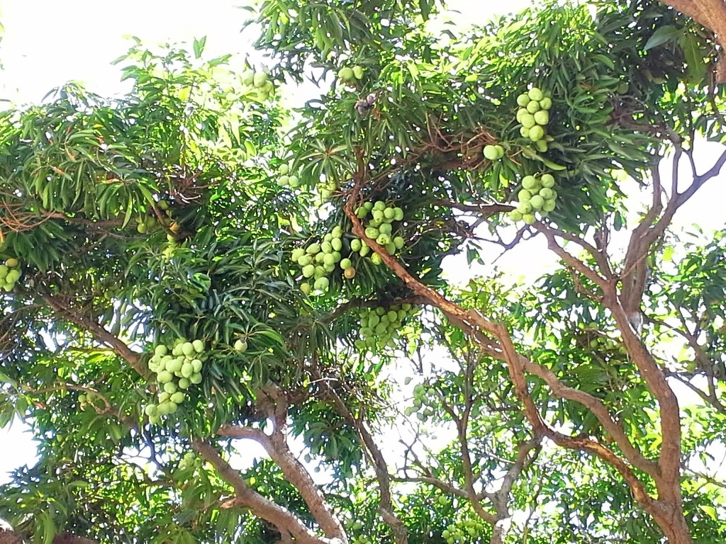 See all those mangoes up there in the tree, as I sit here writing I hear them crashing to the floor one by one. They are so heavy they sound like rocks landing, I am just waiting for one to land on my head. I have learned by watching mangoes fall how it is that Dominicans are so good at baseball. The manager of the building we are living in took a long pole to poke some of the mangoes growing on this tree, as one fell she stuck out her hand and caught it. Now if Canadians did this with apples…..